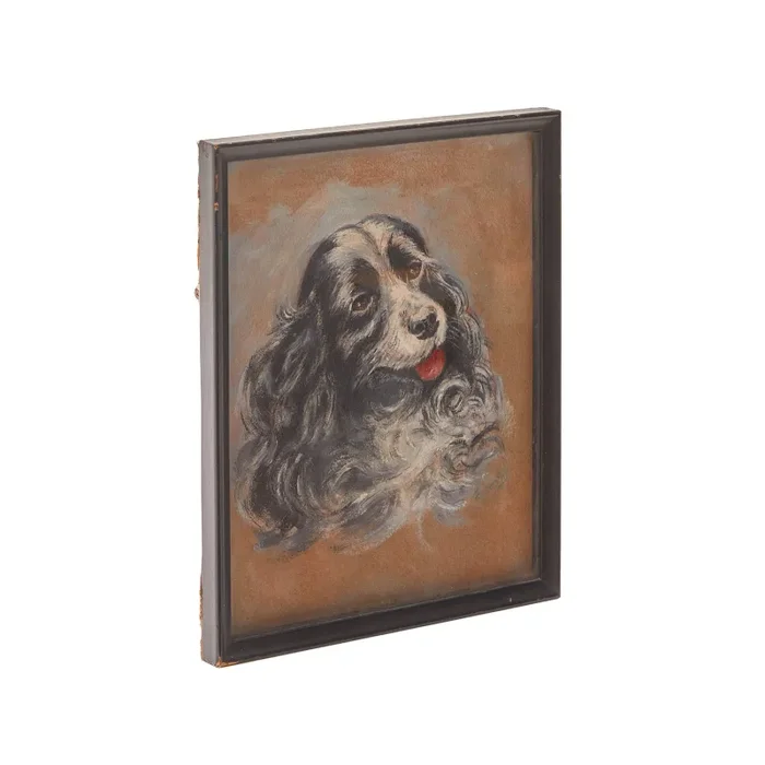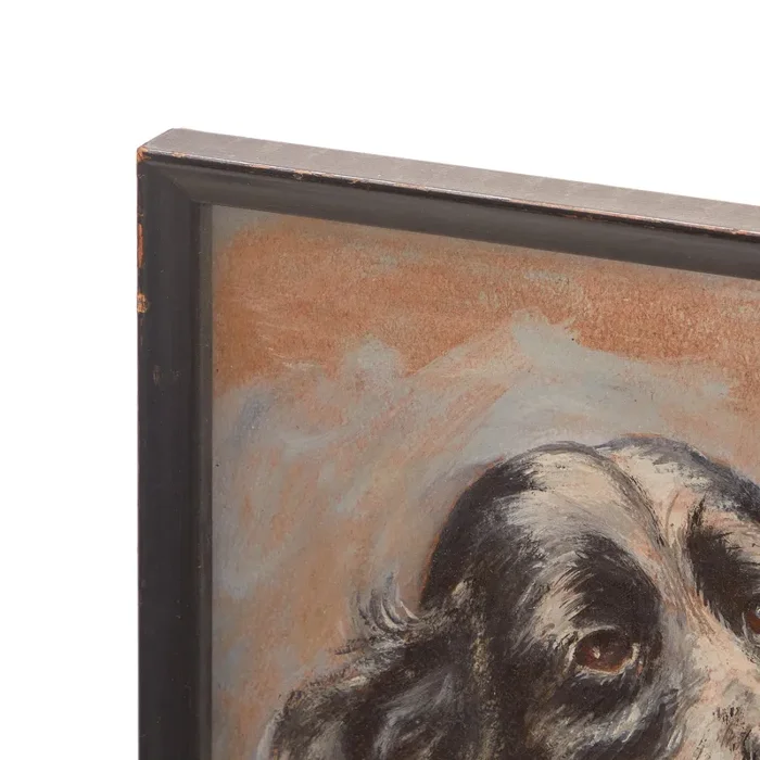Details: Oil stick painting of a happy dog on brown background in a weathered black frame