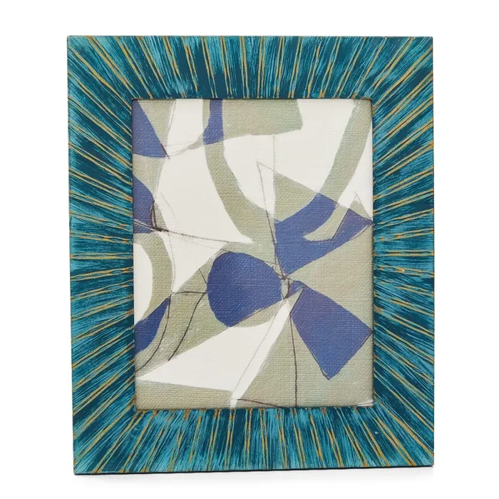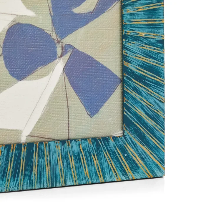Details: White, grey, and blue overlapping abstract painting in a weathered blue & white-striped frame