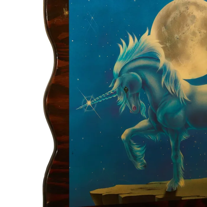 Details: Blue shiny unicorn and moon painting on a wavy boarders wooden board