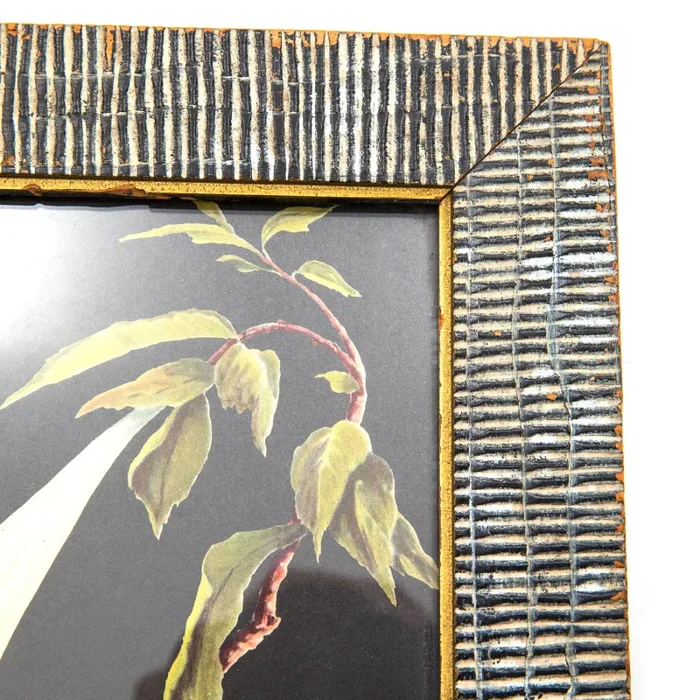 Details: Watercolor of a white angel’s trumpet in a red pot on a black background with a black and white wood painted frame