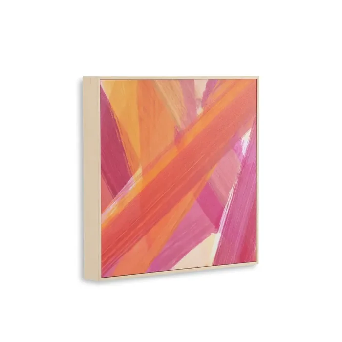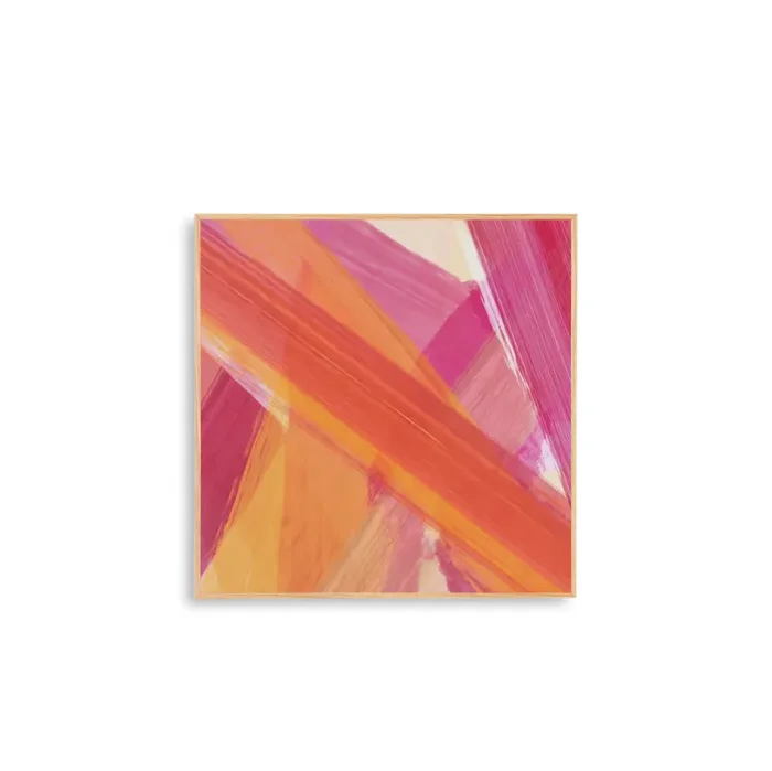 Details: Pink and yellow abstract painting in a natural light wood frame.