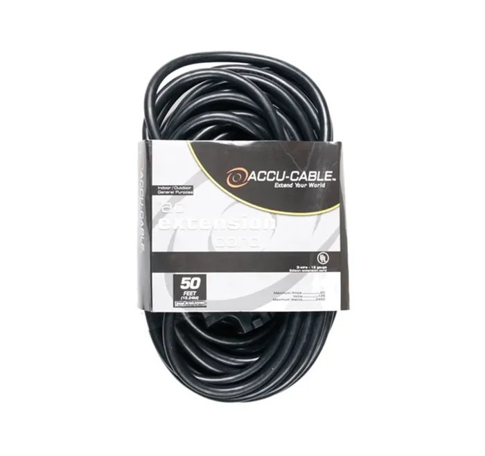The Accu-Cable EC123-3FER, 12AWG Power Extension Cord with Triple Tap Outlet can handle a maximum of 20 amps, 125 volts, and 2400 watts. The plug features a 3-prong male termination with ground which makes it appropriate for indoor and outdoor general-purpose professional applications within the specified power rating. The other end of the cord features three 3-prong female connectors for powering up to three different devices from one extension cord.