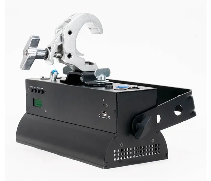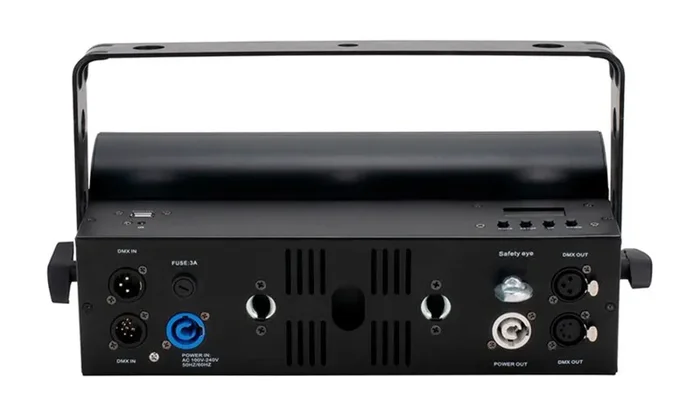 The rear panel offers 3-pin and 5-pin DMX connections with twist lock power input and output for daisy-chaining data and power to several fixtures. A USB port is provided for easy firmware updates. The American DJ Jolt 300 includes a scissor yoke, Omega bracket, and locking power cord.