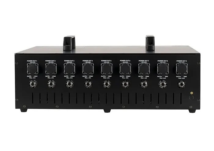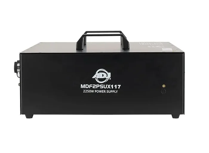 The ADJ MDF2PSUX117 is a 2250W external power supply for up to 117 ADJ MDF2 dance floor panels. It has two power locking inputs and two power breakers that each control 6 outputs. There are 9 power outputs with rubber protectors and 9 resettable breakers. There are two carrying hands on the top of the power supply, with rubber feet on the bottom.