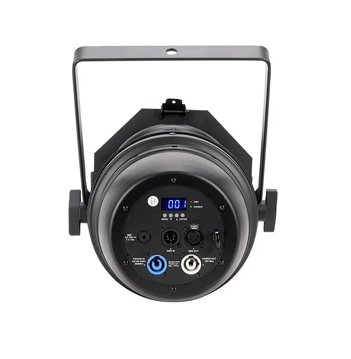 An adjustable bracket, locked in place using a pair of large plastic thumb screws, allows the fixture to hang from a truss or lighting stand at any desired angle. On the rear panel are 5-pin DMX input and output sockets as well as locking power input and output sockets, which allow the electrical supply for multiple fixtures to be daisy chained from a single outlet. Mode selection and DMX addressing is facilitated by an LED display and four corresponding push buttons, also located on the rear panel. In addition to standard DMX, the fixture is also compatible with the RDM protocol to allow remote fixture addressing.