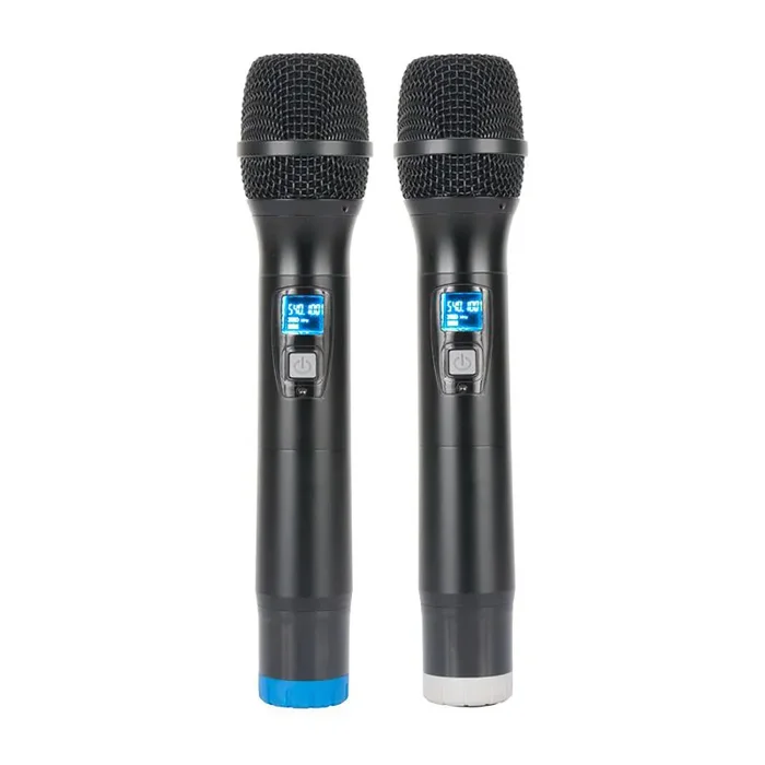 The ADJ WM219, Two-Channel UHF wireless handheld microphone system includes two wireless microphones, two different color-coded rings (to differentiate each microphone) and a wireless receiver with individual volume control and audio input for each microphone.
