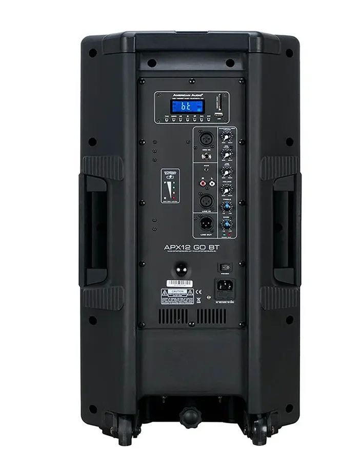 The APX12 GO BT features wheels and a retractable handle making it easy to transport to any indoor or outdoor event. Whether you are doing a presentation, playing music outdoors, or using it to as your background system as you play your favorite instrument or sing your favorite song. Perfect for rentals or production as well as extending the boundaries of any event.