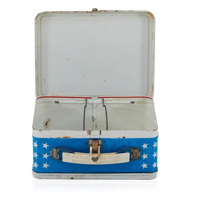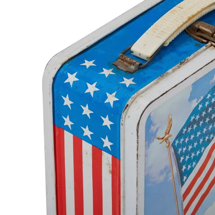 Details: Vintage tin lunch box with patriotic American flag design