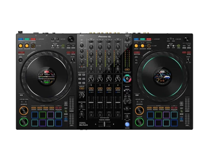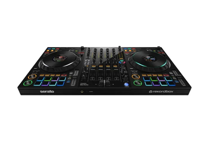 The Pioneer DJ DDJ-FLX10, 4-Channel Performance DJ Controller for Rekordbox or Serato DJ Pro. The DDJ-FLX10 introduces several new features compared to its predecessor, the DDJ-1000SRT, such as advanced track separation capabilities, an enhanced On Jog Display for more detailed track information, Mix Point Link for better transition management, DMX output for lighting control, an upgraded MAGVEL FADER with improved precision, compatibility with both rekordbox and Serato DJ Pro, a vibrant multicolored jog wheel ring, and a USB Type-C connection for more efficient connectivity