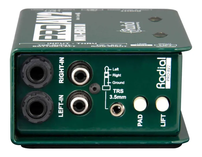 The Radial ProAV2 is a stereo passive direct box designed for audio-video integrators and technicians, with an array of input connector options to easily interface with a wide range of audio equipment. The ProAV2 is an indispensable device for live sound engineers and audio-video technicians alike, with the ability to seamlessly interface nearly any device with a pro audio system. A 3.5mm stereo input jack and dual 1/4″ and RCA connectors ensure that you won’t ever be hunting around for adaptor cables, while ultra-quiet performance with transformer isolation helps eliminate hum and buzz from ground loops. The ProAV2 maintains stereo separation and exhibits linear frequency response from 20Hz to 20kHz, with balanced mic-level XLR outputs that allow you to send signals through a multichannel audio snake on stage or into two channels of a mixing console.