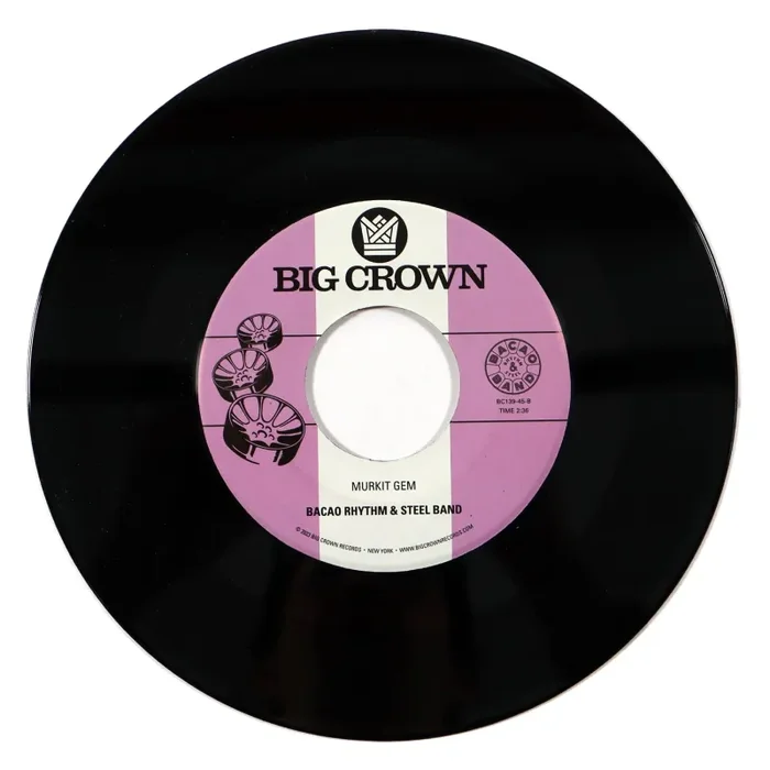 “Bacao Rhythm & Steel Band return with another set of covers bound to get you out of your seat and on your feet. The mysterious German steel pan outfit is working on their fourth studio album now and treat us to another must have two-sider to hold us over while they finish it. This one is sure to become another favorite among DJs worldwide.The A side finds BRSB taking on a huge hit with an eerie cover of Drake’s ‘Hotline Bling.’ The intro melodica hints at the melody and when the beat drops and the top line plays on the pans all bets are off. The B side is something of a Big Crown family affair as Bacao covers ‘Murkit Gem’ from El Michels Affair’s Yeti Season album. The tune lends itself to the pans with its infectious melodies and the way BRSB plays it, it takes on a James Bond spy chase energy that works perfectly.” – Big Crown Records