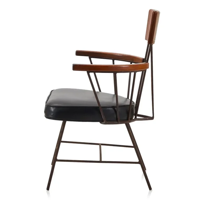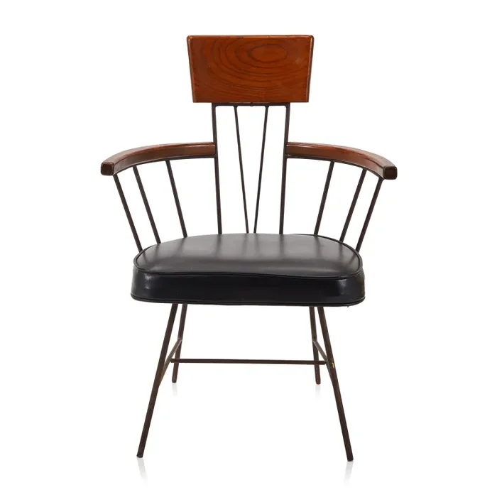 Back Leather & Wood Paul McCobb Ash Iron Arm Chair