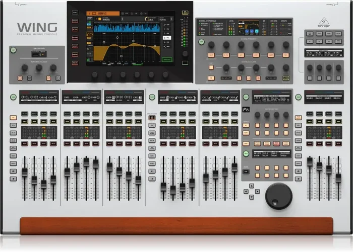 The WING control surface utilizes a large capacitive touchscreen interface with touch-sensitive rotary controls for new ease of operation. Three separate fader sections and a Custom Controls section can be tailored easily and intuitively to meet your personal requirements. No matter if you need a specific bus to send fader next to the corresponding channel fader, or a dedicated “money” channel always at your fingertip, or even sharing the surface with two engineers – WING can be configured to elevate your production to a new level. You can even replace and customize the massive wooden armrest with something funkier if you like.