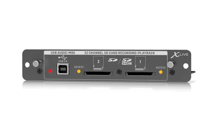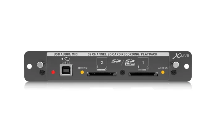 The X-LIVE interface card expands on the already stellar performance of the X-USB card that has been standard in X32 consoles for years. The same 32-channel bi-directional audio I/O via USB 2.0 is available, providing 32 channels for recording and playback, plus remote operation of your DAW via HUI/Mackie Control emulation. The addition of dual SD/SDHC slots provides fully independent recording and playback of up to 32 channels of uncompressed WAV files in consistent sessions – up to the maximum capacity of the SD cards. Multi-channel recording without a laptop, as well as virtual sound checks, live backing-track support, accurate marker handling and manipulation, and full remote operation from PC, Android or iPad apps and X-TOUCH control surfaces. All of this barely begins to scratch the surface of what X-LIVE can bring to your X32.