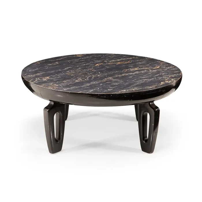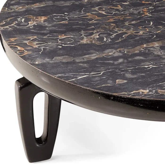 Details: Dark laminate coffee table in dark brown and black with geometric legs and round top