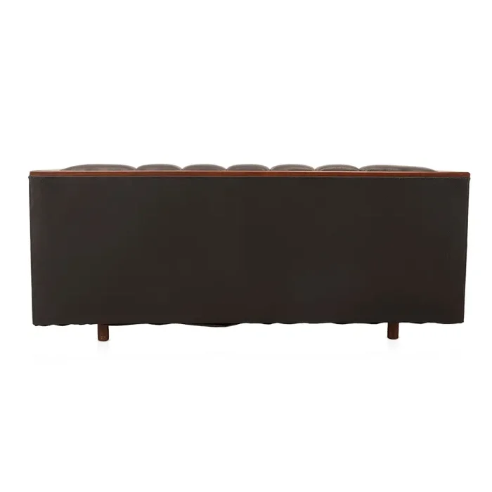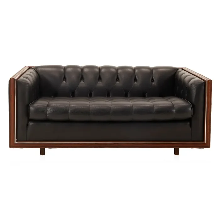 Details: Black tufted leather loveseat with wood frame and metal trim accent.