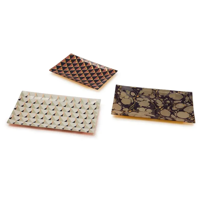 Description: Black, orange, and gold accented ceramic plate with triangular tessellation pattern