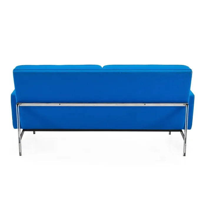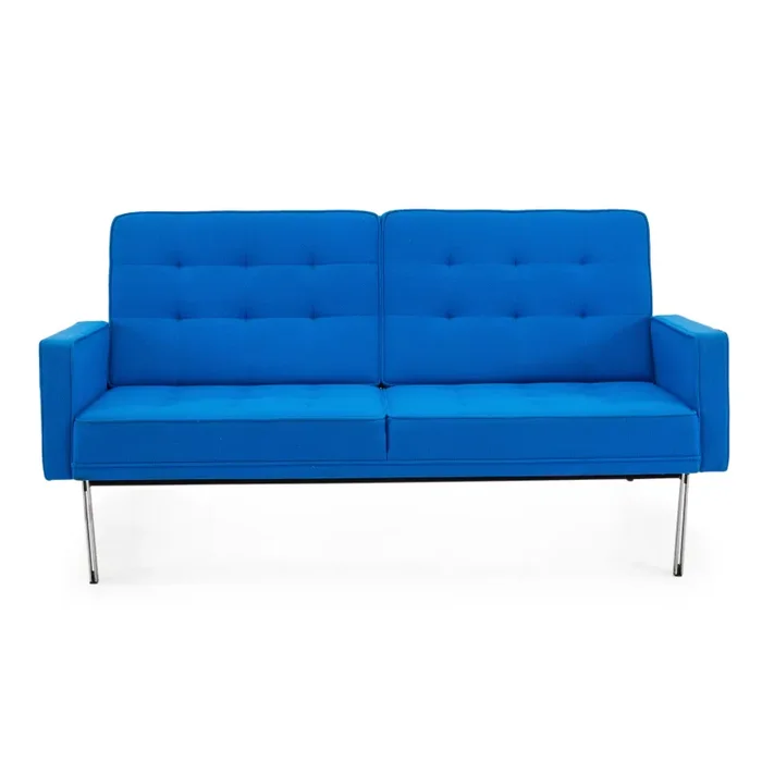 Details: Cobalt blue tufted split rail modern loveseat sofa with armrests. Piece features fabric upholstery and metal frame.