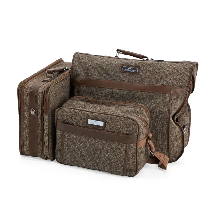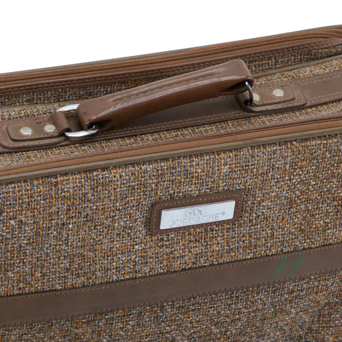 Details: Tan soft shell vintage suitcase with brown leather trim