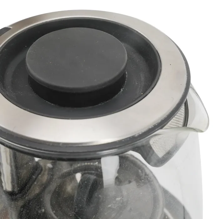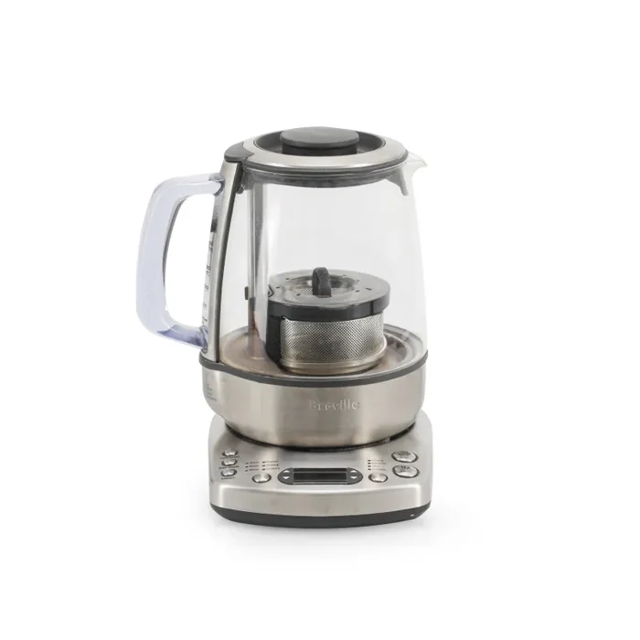 Details: Electronic Breville tea kettle with silver base and metal diffuser.