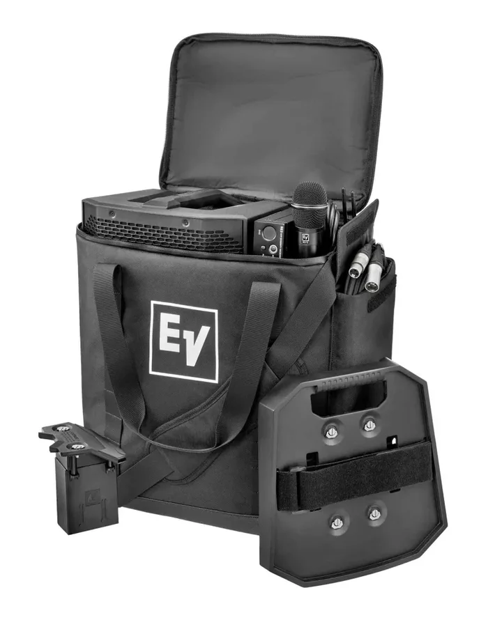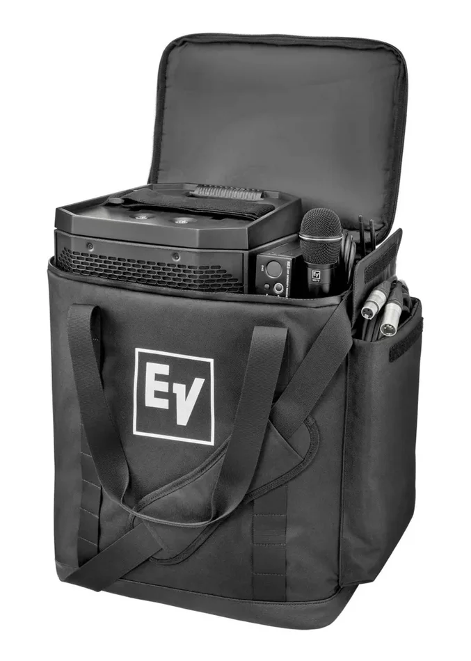 The Electro-Voice EVERSE8 Speaker Tote Bag Protection of EVERSE8 speaker during transport wear and tear with the Electro-Voice Tote for EVERSE 8, a padded gig bag that’s designed to hold and carry your EVERSE 8 speaker with plenty of room for accessories. The bag’s internal section provides a divider to keep things in place with room for the EVERSE 8 speaker as well as the accessory tray, wireless microphone receiver and microphone, while two outside pockets store accessories such as XLR cables, power cords, mobile devices, and charging cables. The bag features two handles and a removable shoulder strap.