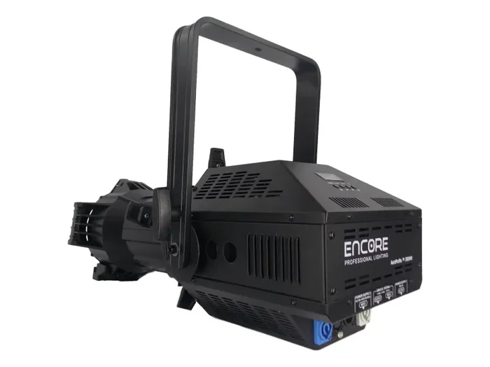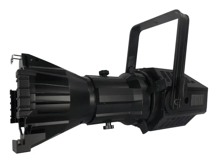 The new Encore Professional Lighting AuraProfileT™ 200WW is an Ellipsoidal featuring a 200 watt Warm White Flicker Free COB LED rated at an average 100,000 hours (CRI >94). This fixture has 19°, 26°, 36°, and 50° lens options (purchased separately), manual framing shutters (4 blade style), manual focus, size B gobo, electronic strobe/dimming (0-100%), 4 dimming curve modes, single yoke hanging bracket / stand mounting, power-con in & through, 5-pin DMX in & through, fan cooled (low-noise), and heavy duty aluminum exterior build.