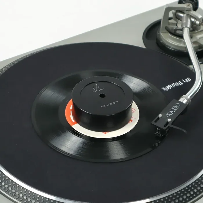 - integrated low-profile 45 adaptor on one side for large-hole 7-inch records, flat on the other side for 12-inch records