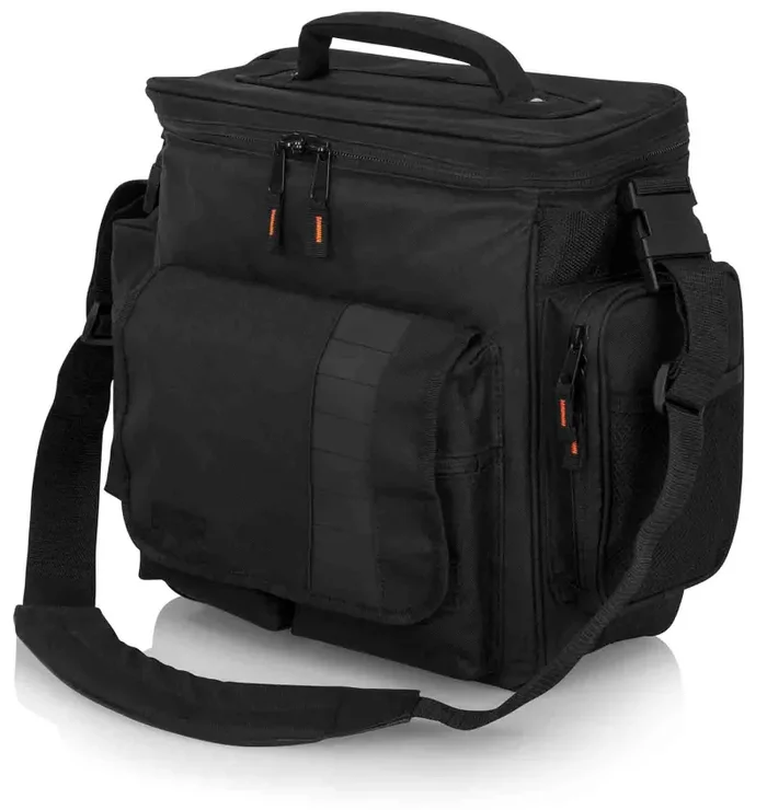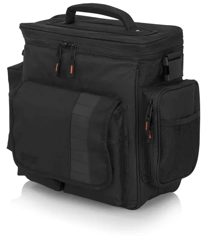 The Gator G-CLUB-DJ BAG is a G-Club Series DJ Bag has4 Exterior Pockets Hold Serato Style Interface and Other DJ Accessories. Bright Orange Liner for Better Visibility in Dark Clubs or Rooms. Strap on Back of Case Designed to Allow Bag to Piggy-Back to the G-CLUB-DJ CART or Most Other Wheeled Luggage. 4 Exterior Pockets Hold Serato Style Interface and Other DJ Accessories. Padded Adjustable Shoulder Strap. Nylon Construction with 15mm Internal Padding.