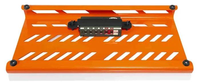 The Gator GPB-BAK-OR is Lightweight Aluminum Pedal Board. Pedal Surface Measures 23.75″ x 10.66″. British Orange Finish. Universal mounting bracket provided for mounting most common power supplies beneath the board. Angled for ease of access to pedals. Cable routing perforations make routing signal and power easy. No Slip Rubber Feet. Includes Adhesive Velcro Strips.