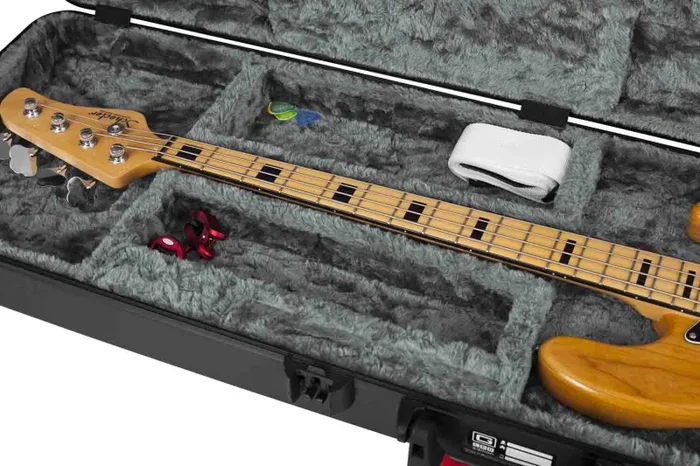 The Gator Case GTSA-GTRBASS-LED is designed to fit Electric Bass Guitars. Unique interior LED light to illuminate guitar and storage compartment. Military grade polyethylene exterior for impact-resistant protection. TSA Accepted locks for hassle-free travel. Black plush interior to guard against scratches and dents. Extended Reach Protective Neck Cradle. Push-button release latches are impact resistant for extra durability. Ergo-grip molded handles for comfort. Special LED Edition badge on exterior.