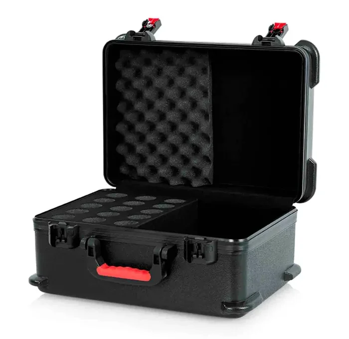 The Gator Cases GTSA-MIC15 is designed to Hold Up to (15) Wired Microphones. Nearly Indestructible Polyethylene Construction. TSA Accepted Locking Latch Ideal for Air Travel. Foam Padded Microphone Drops. Large Internal Storage Section for Cables and Accessories. Ergo-grip Injection Molded Handle. Surface Mounted Impact Diversion Latch Housing and Red Release Trigger. Black Powder Coated Hardware and Continuous Valance.