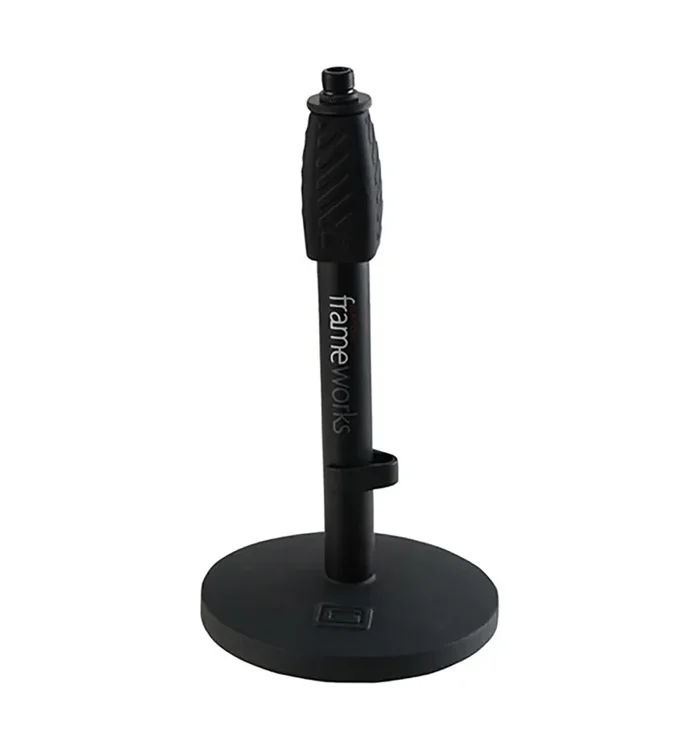 The Gator Frameworks GFW-MIC-0601 is a desktop mic stand with a 6″ round base, and standard twist clutch.