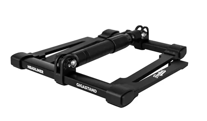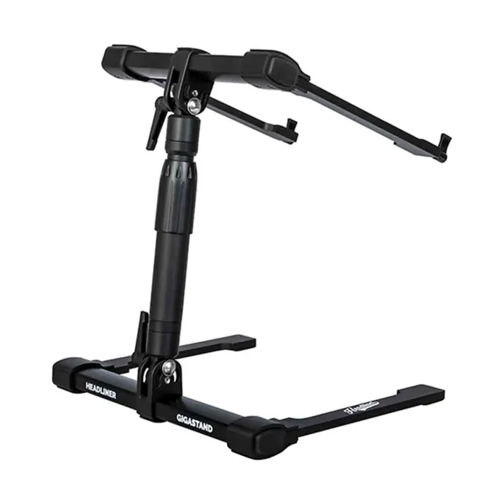 The Headliner Gigastand fits laptops up to 17″ and can also be used with other devices such as iPads, small controllers, samplers, drum machines, etc. Carrying pouch included.