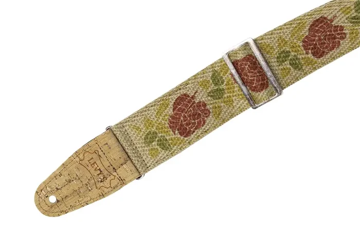 The Levy’s Guitar Strap with Printed Rosa Motif in Pink and Red on Natural Hemp Webbing With 2-Ply Cork Ends. Hemp strap features a 2.5″ tall pocket on the inside for easy access storage. 2-ply natural cork ends to support the weight of most guitars. Silver metal slide and loop adjust from 37″ to 62″. Natural and organic strap is vegan and cruelty-free using sustainable materials.