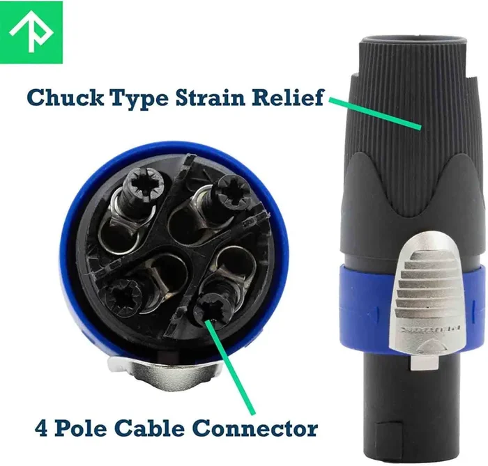 The Neutrik NL4FX is a 4-Pole SpeakON Cable Connector with Dark Grey Bushing 4pc. 4 pole cable connector, chuck type strain relief, dark grey bushing the industry-standard for loudspeaker connections offer extremely reliable and robust cable connectors with a reliable locking system. They feature solid contacts with screw-type terminals including stranded wire protection which offer also solder termination. -Current rating 40 A rms continuous -Up to 50 A audio signal, duty cycle 50% -High impact materials – long-lasting and reliable -1-piece strain relief, chuck for 7 to 14.5 mm cable O.D. -Improved screw-type termination for highest pull-out force