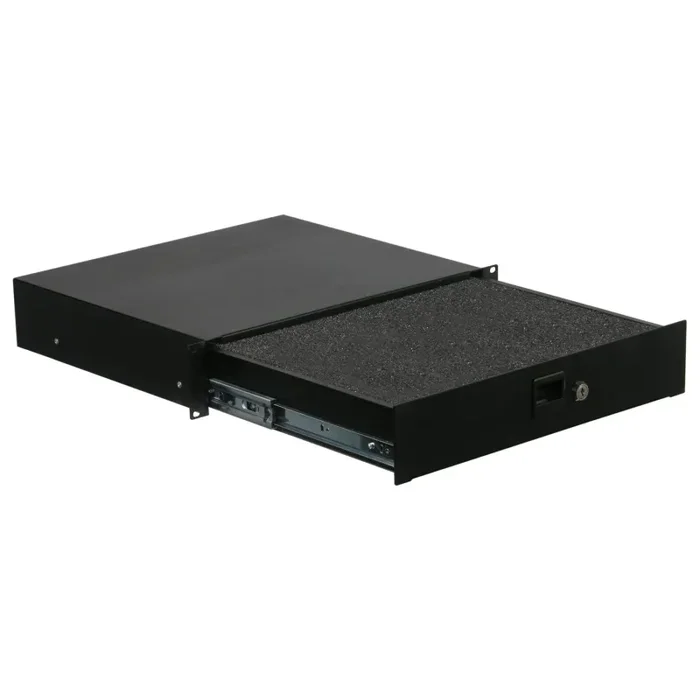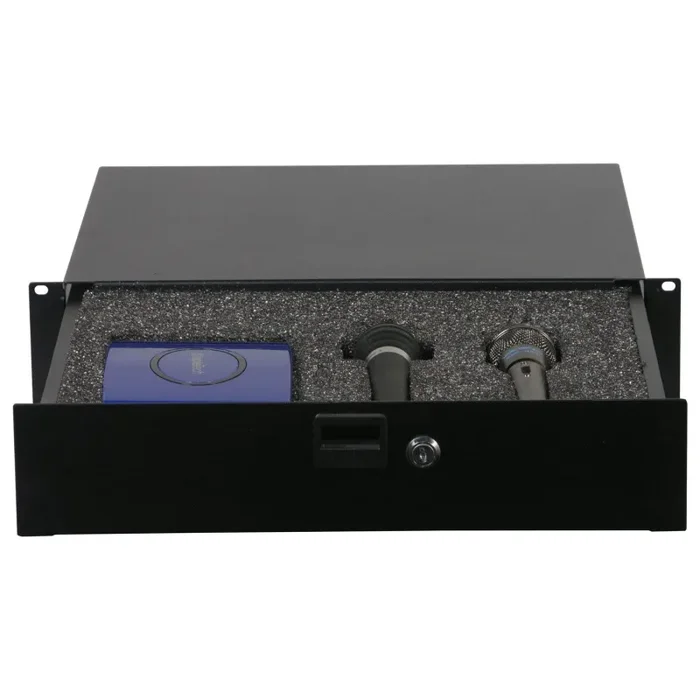 The ADFRD02 is a two-space (3.50 in.) high lockable accessory rack drawer. Included are interior diced foam sheets great for storing hard drives, mics, interfaces (Serato, Traktor, etc.), and other gig essentials.