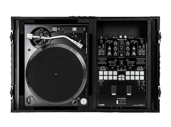The FZGS1BM10WBL Low Profile Glide Style DJ Coffin holds one 10″ format mixer and one turntables in battle position. The unique design allows you to configure your setup as you choose with the mixer at he left or right side as preferred, and with its glide platform tension latch rail system you can add our optional Producer Series |GSABL| angled add-on panels. Other features include rugged built-in roller wheels, recessed latches and spring-loaded handles, heavy-duty ball corners, and front and read mixer section V-cut access panels. Cabling is clean and easy with convenient access ports throughout the case. Our turntable DJ coffins can accommodate Technics as well as Numark, Pioneer, Stanton, and similar sized turntables.