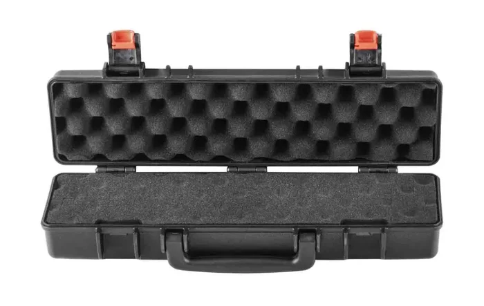 The Odyssey VU150302 Vulcan Injection-Molded Utility Case with Pluck Foam features an interior space of 16 x 3.75 x 1.75″ and comes with cubed foam sheets that fully take up the interior. The cubed foam can be plucked as needed to customize to your gear. The case also comes with convoluted foam under the lid. The case is impact resistant, watertight, and dustproof. It has a comfortable carrying handle, a pressure release valve, and padlock holes. It’s also stackable with other Vulcan cases of the same size.
