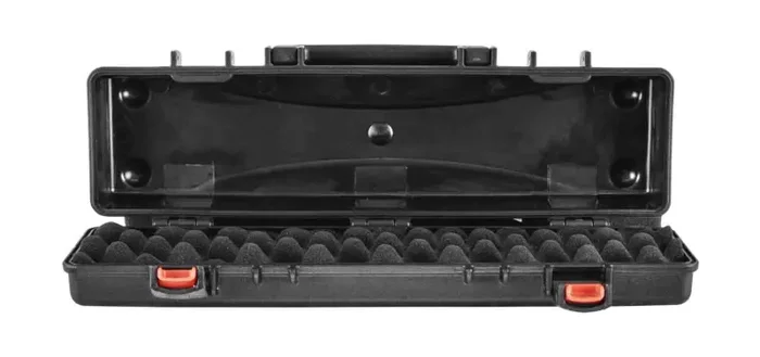 The Odyssey VU150302NF Vulcan Injection-Molded Utility Case – 16 x 3.75 x 1.75″ Interior features an interior space of 16 x 3.75 x 1.75″ and comes with convoluted foam under the lid. No foam is included for the interior space. The case is impact resistant, watertight, and dustproof. It has a comfortable carrying handle, a pressure release valve, and padlock holes. It’s also stackable with other Vulcan cases of the same size.