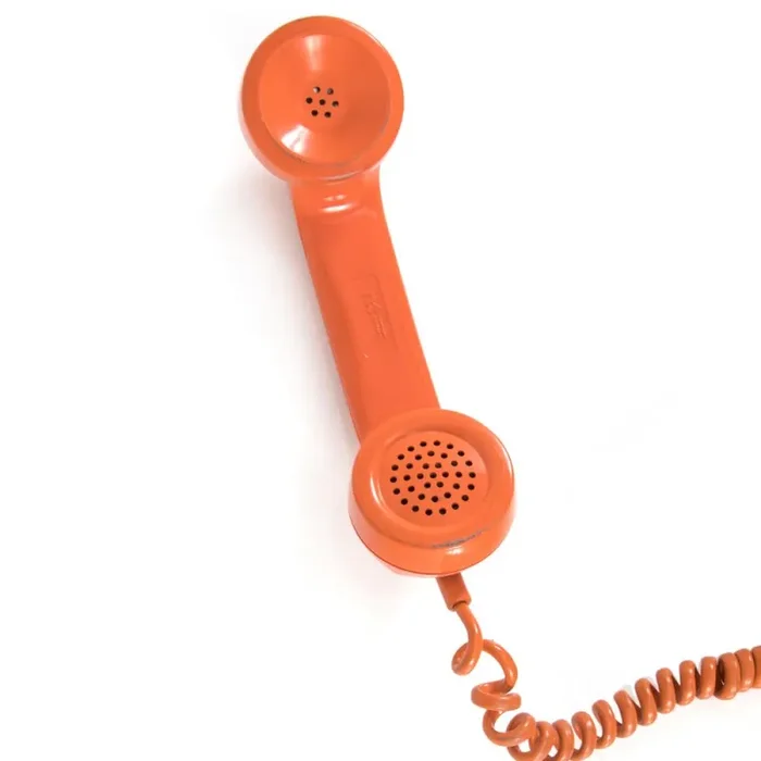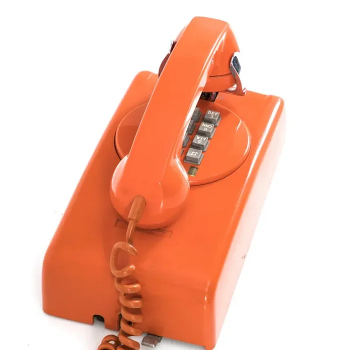 Details: Orange wall phone with circular touchtone area and grey buttons.