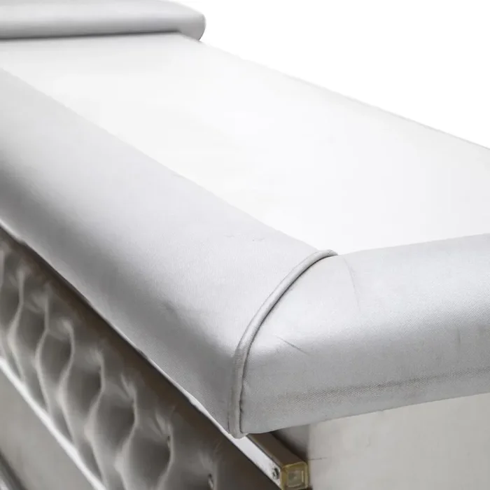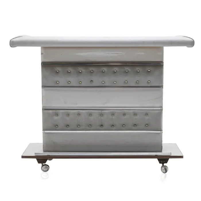 Details: Silver bar on wheels with padded front and top