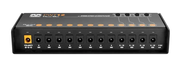 The PWT 12 is a heavy duty (2000 mA) universal pedal board power supply with 12 single-isolated 9 V DC, center-negative female pin-connector outputs. The variable outputs enable the simulation of voltage drop or ‘battery sag’ in old batteries. The power supply is regulated for constant voltage supply and protected against short circuit and overloading. The PWT 12 is equipped with a power LED and a two-color LED output status indicator. It is supplied with an AC adapter and a set of DC cables. The PWT 12 is the ideal solution for power-hungry foot pedals or 9-volt effects units that can be operated at higher voltages for increased dynamics and stability.