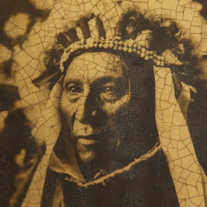 Details: Sepia toned, cracked photograph of a Native American in full headdress.