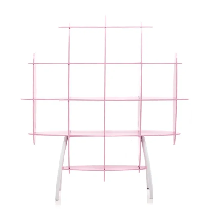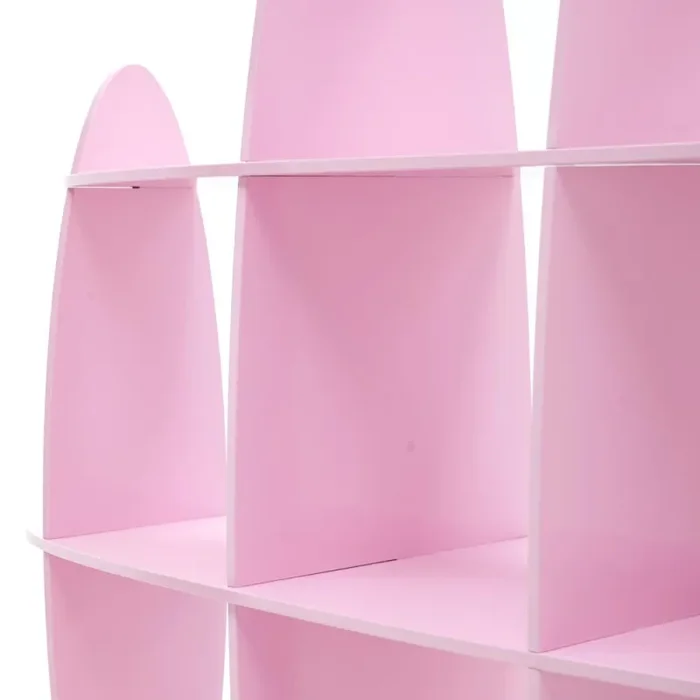 Details: Plastic pink shelf in a circular abstract shape made of surfboard shapes