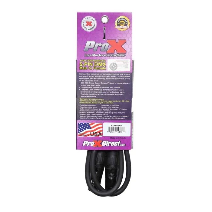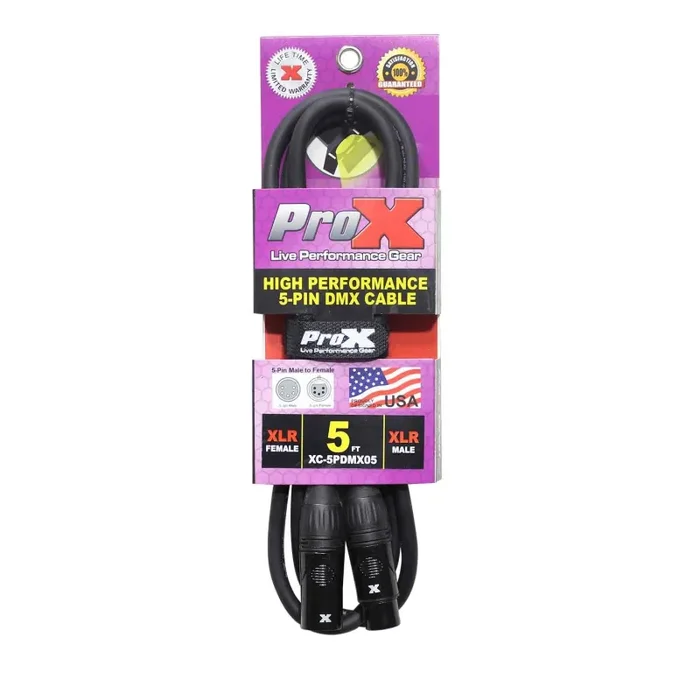 The ProX XC-5PDMX05 cable is ideal for DMX connection applications where a device with a male DMX XLR-5 output/input needs to be connected to a device with a female DMX XLR-5 output/input. 22AWG Oxygen-Free Copper (OFC) conductors for maximum signal transfer.