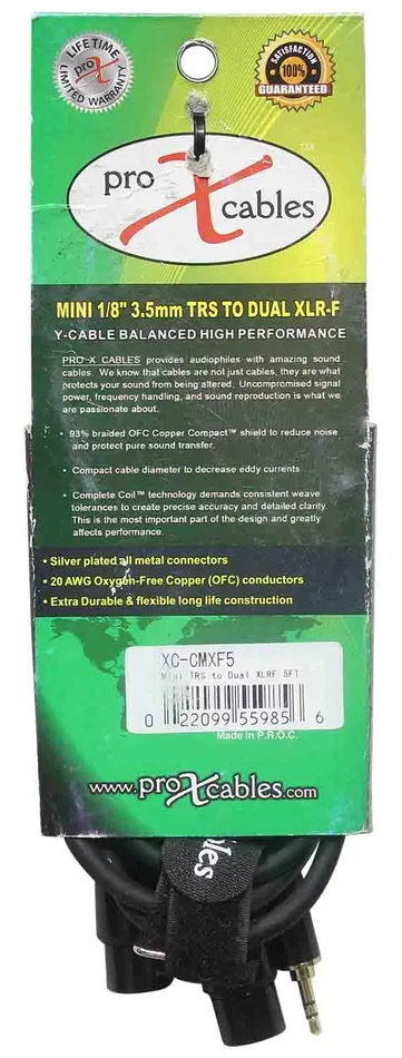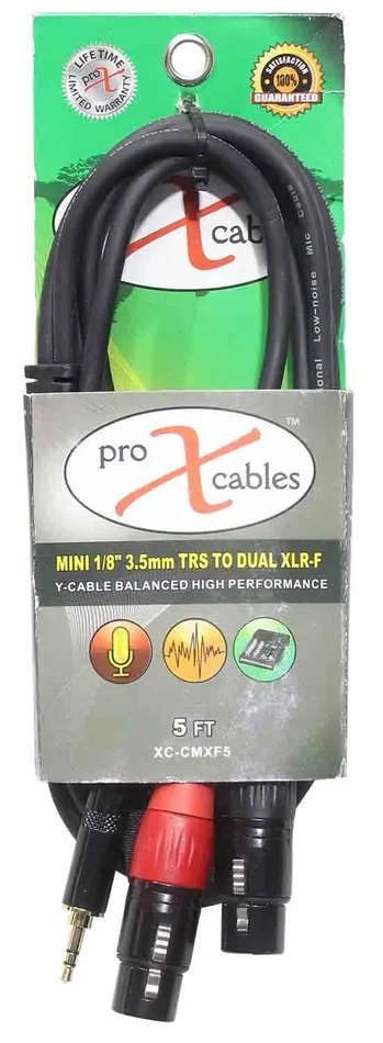 The Prox XC-CMXF5 is an Unbalanced 3.5mm Mini TRS-M to Dual XLR-F High-Performance Audio Y Cable – 5 Feet is ideal for professional touring and live sound applications where a device with a 3.5mm Mini TRS-M output/input needs to be connected to a device with a Dual XLR-F output/input connections.ProX cables are built with uncompromised quality with excellent performance at each connection – Instrument cables, Speaker cables, RCA cables, DMX cables, Power cables and more. Our cables are made for professionals, by professionals.
