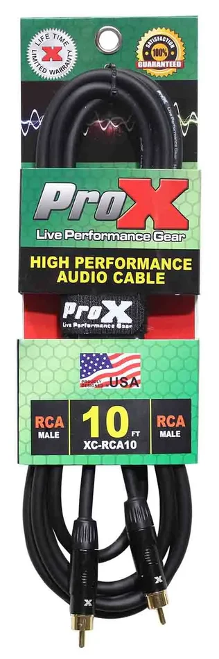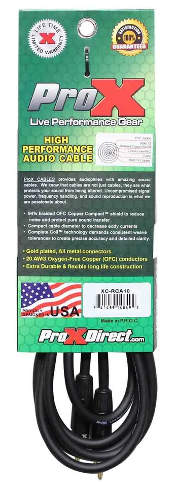 The Prox XC-RCA10 is a High-Performance Audio Cable RCA to RCA – 10 Feet is ideal for professional touring and live sound applications where a device with an RCA output/input needs to be connected to a device with an RCA output/input. 93% braided OFC Copper Compact shield to reduce noise and protect pure sound transfer. Compact cable diameter to decrease eddy currents.