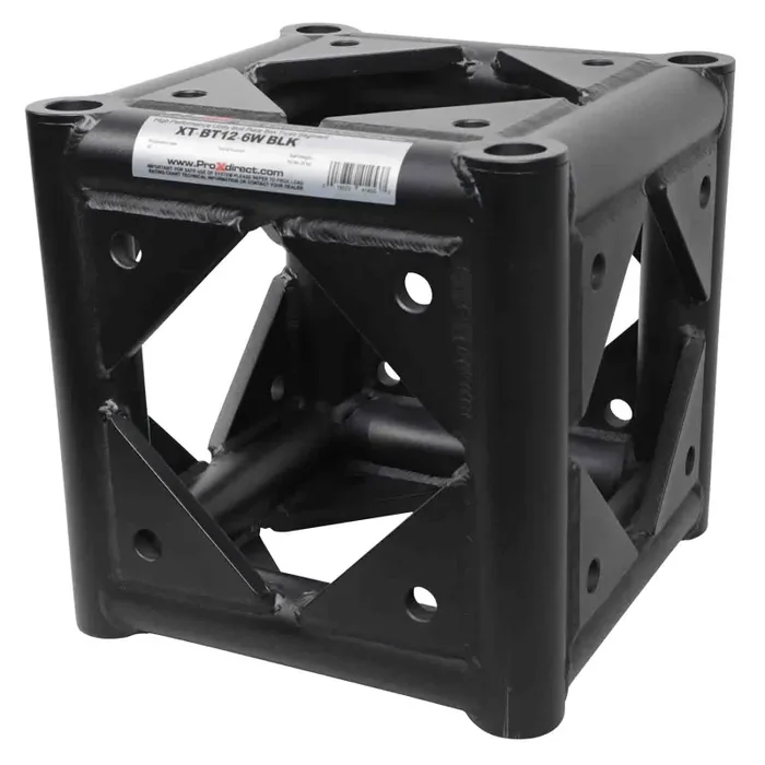 The ProX XT-BT12-6W BLK is a BoltX 6-Way Block Bolted Professional Box Truss in Black Finish. Box Truss is designed and engineered for many applications like stage lighting, concerts, Ninja Obstacle Course type construction, and similar uses. Setting ourselves apart from other box truss manufacturers BoltX has an innovative end plate designed and manufactured with heavy-duty aluminum material, welded on both sides, and our exclusive circular rings at each corner of the truss to reduce or eliminate damage to the main chord ends. Our outstanding quality control and manufacturing techniques assure excellent fitment at every connection to expedite your setups. This segment has a stealth black powder-coated finish for hiding cables and lighting, it also has a flat anti-glare look. Compatible with most other 12? Professional Box Truss Manufacturers utilizing a 6.75″ bolt center pattern. Each 6 Way Block includes Four sets of Four 5/8″ – 11 x 2.5″ (NC) attachment bolts, nuts, flat & lock washers. (Total of 16 Bolts nuts and washers).