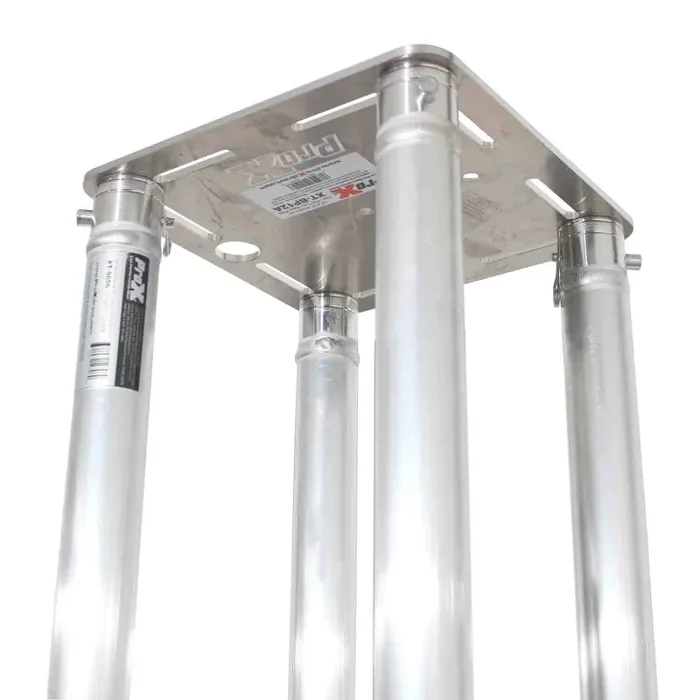 The ProX XT-S4X656 TOTEM Truss Totem Package assembles some of the most popular products that are used for DJ Totems. At the core is four of the ProX XT-S656 Single Tube Truss sections which are made with 2mm EN-AWT6 6082 Aluminum for safety and strength, an XT-BP30A 30 In. x 30 In. 8mm Aluminum Base Plate, and an XT-BP12A 12″ X 12″ F34 8mm Aluminum Top Plate With Slots and Mounting Holes. You can use the totem exposed as “all-aluminum” or dress it up for a smooth, finished appearance with the included XTC-SQ656TS-WBG White Lycra-Spandex Cover.