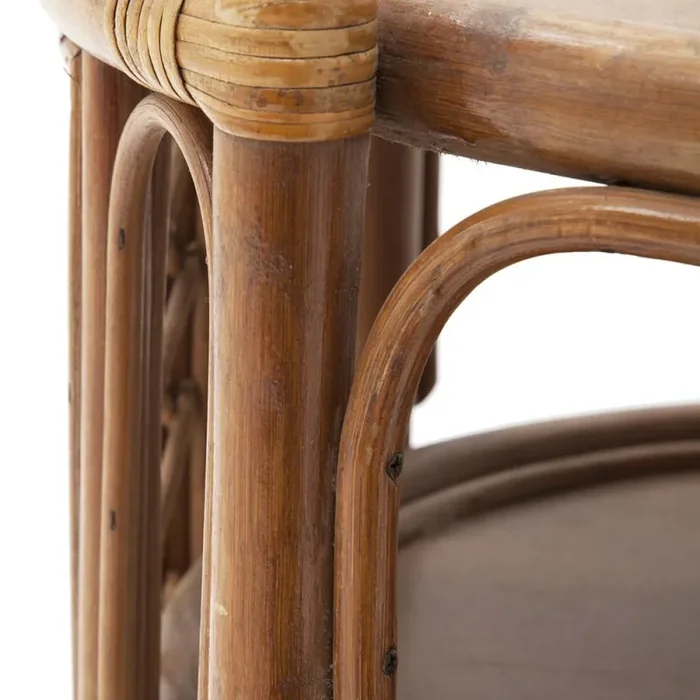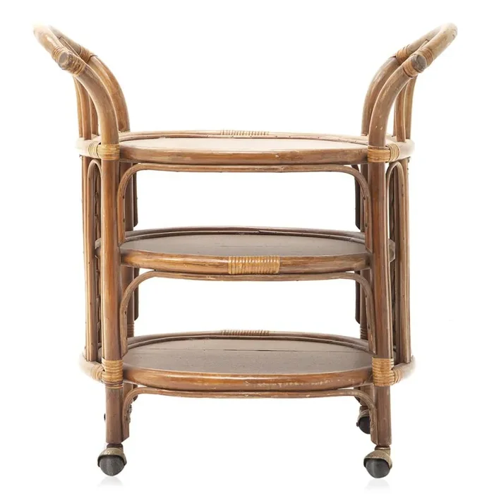Details: Brown rattan cart on wheels with three shelves